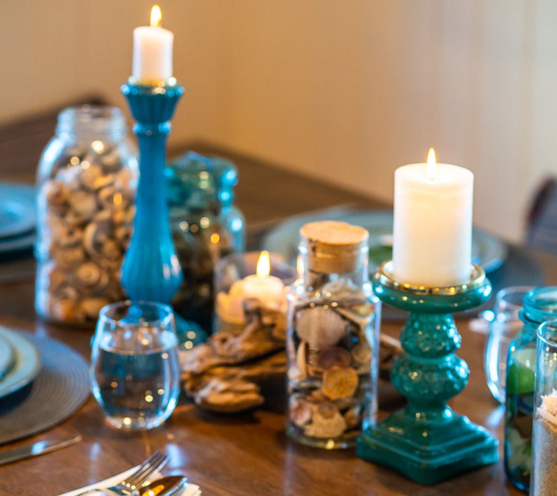 Filling another 2 or 3 vases with sand, a couple of small shells, and a tea light is an easy way to add some creative ambiance to the setting. If you have a couple of other candle holders handy, throw them in to create some definition.